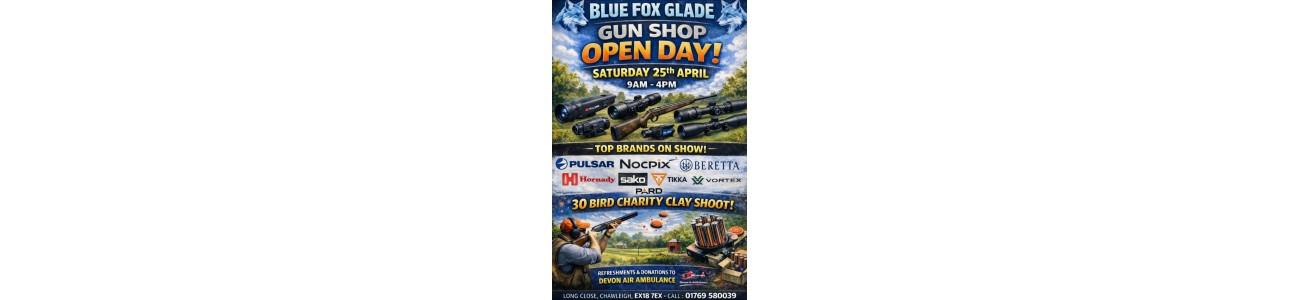 We are a family-run gun shop based in Chawleigh, North Devon. We also run monthly clay pigeon shoots, Blue Fox Glade has two shooting grounds incorporating 200 acres of sporting landscape. Tuition and gun hire is available with advance bookings. Bring your friends or even your boss!