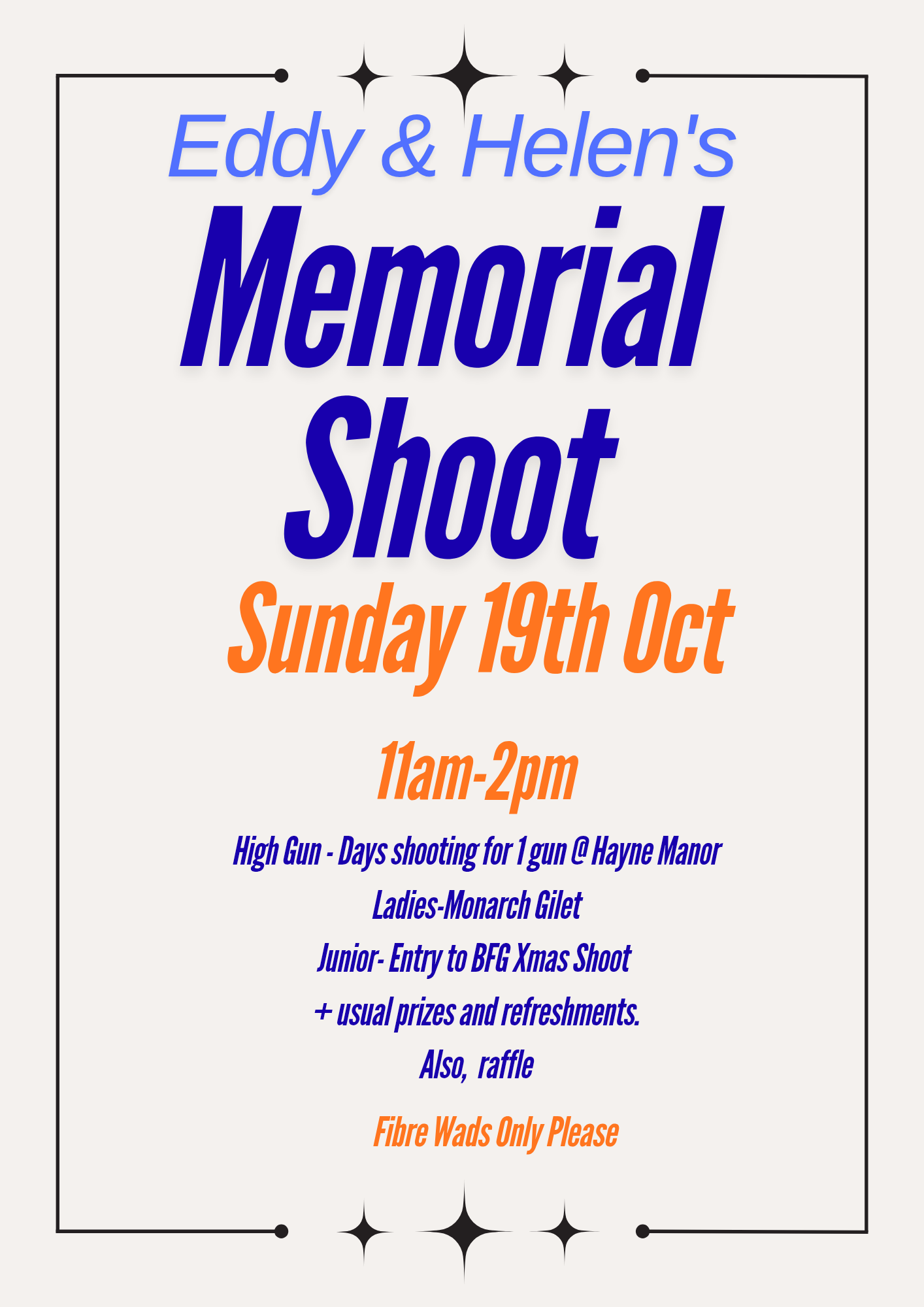 | Start 11AM L/E 2PM Shop Open Day & 30 bird Sporting Starts 9am and Finishes 4:30 |